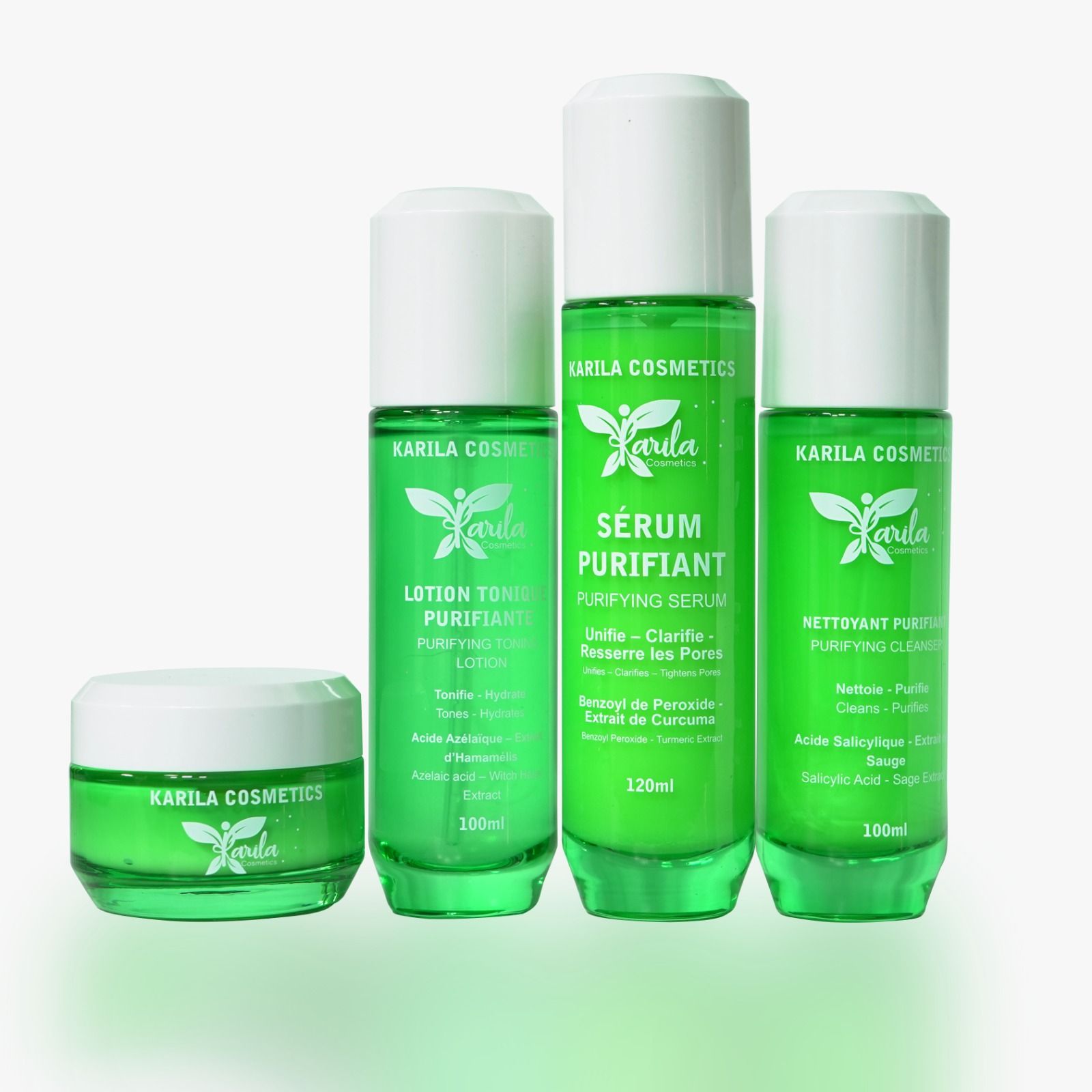 Composée de cinq produits essentiels, Chacun de ces produits vise à traiter l’acné, purifier la peau, diminuer l’excès de sébum, éliminer les tâches d’hyperpigmentation, ainsi que les boutons et les tâches noires.